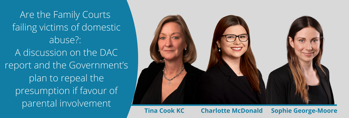 Tina Cook KC, Charlotte McDonald and Sophie George-Moore will discuss the recent report produced by the Domestic Abuse Commissioner, the Government’s plans to repeal the presumption in favour of parental involvement, and the future path for victims of domestic abuse in the Family Court.